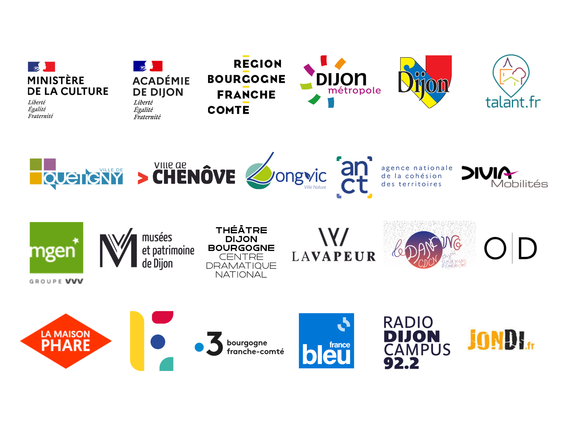 Région Bourgogne Franche Comté – Dijon Métropole – Ville de Dijon – DRAC Bourgogne Franche Comté – Ville de Chenôve – Ville de Longvic – Ville de Quetigny – Ville de Talant – La DDETS – Keolis Dijon DiviaMobilités – MGEN